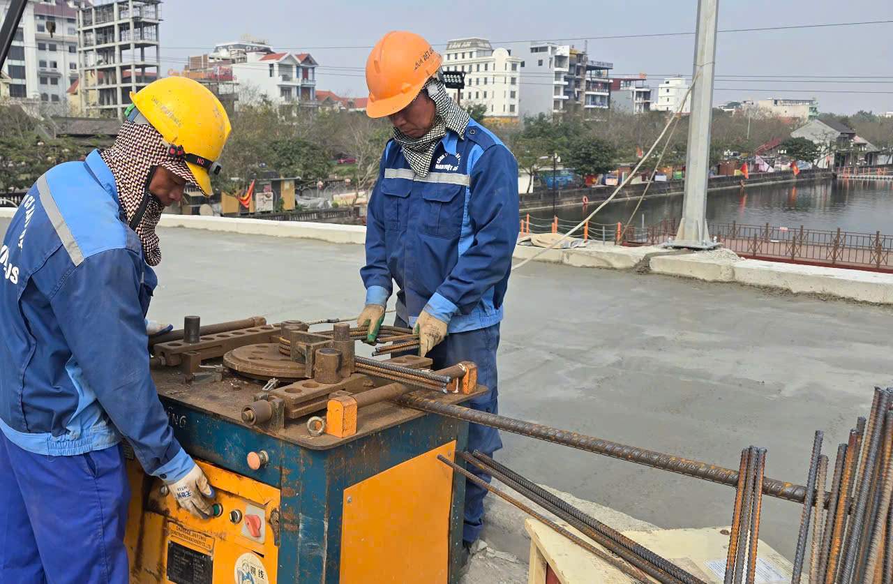 On February 2nd, present at the Trang An bridge construction area, according to the reporter of Lao Dong Newspaper, hundreds of workers along with equipment and machinery are urgently constructing to speed up progress.