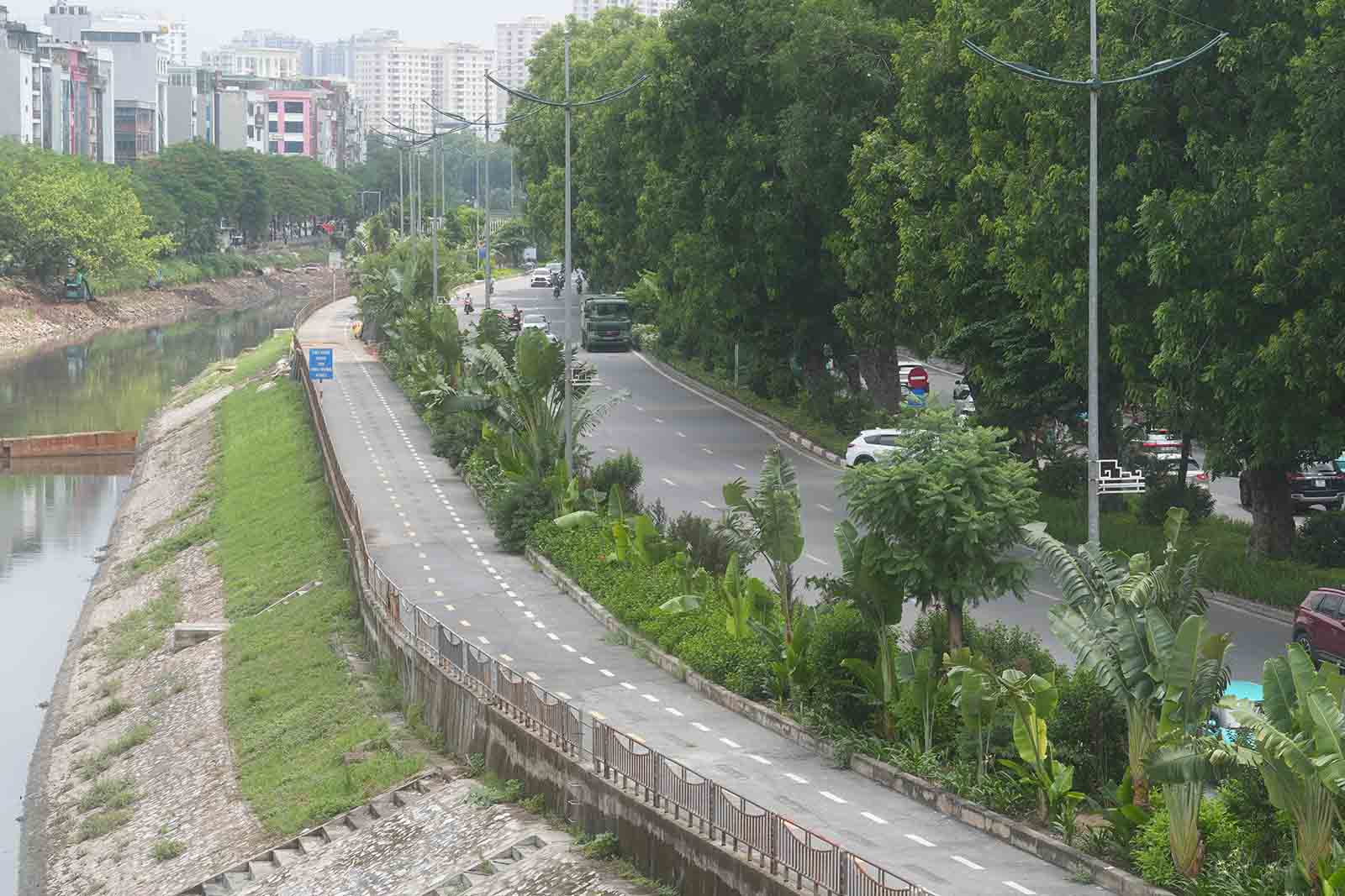 Hanoi - The fence on the road reserved for bicycles along the To Lich River has been dismantled after a period of construction to construct a wastewater treatment system.