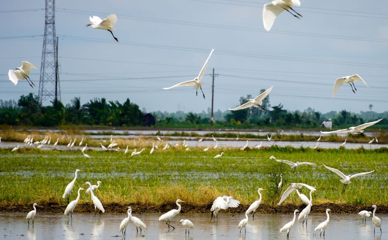 Soc Trang - Flocks of up to thousands of white storks search for prey in fields preparing for sowing, helping farmers destroy harmful insects.