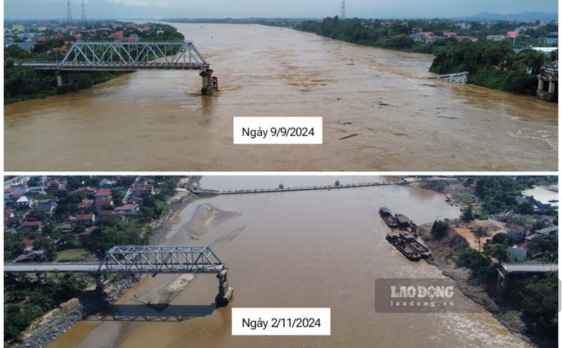 Phu Tho - Compared to the time of the Phong Chau bridge collapse, the water level of the Red River in the area is decreasing, and sand dunes in the middle of the river are starting to appear.