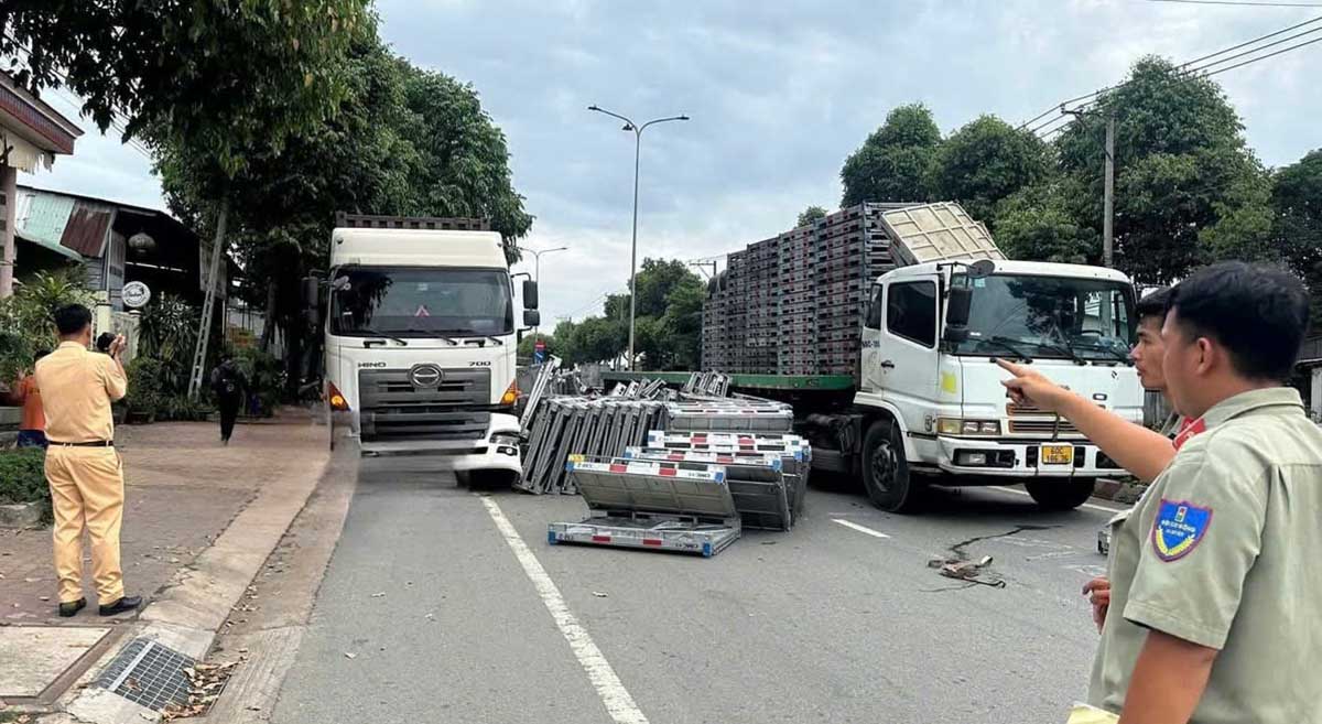 Binh Duong - At around 5:00 p.m. on December 5, Thu Dau Mot City Police were still handling the scene where tons of iron pallets fell onto the road from a tractor trailer.
