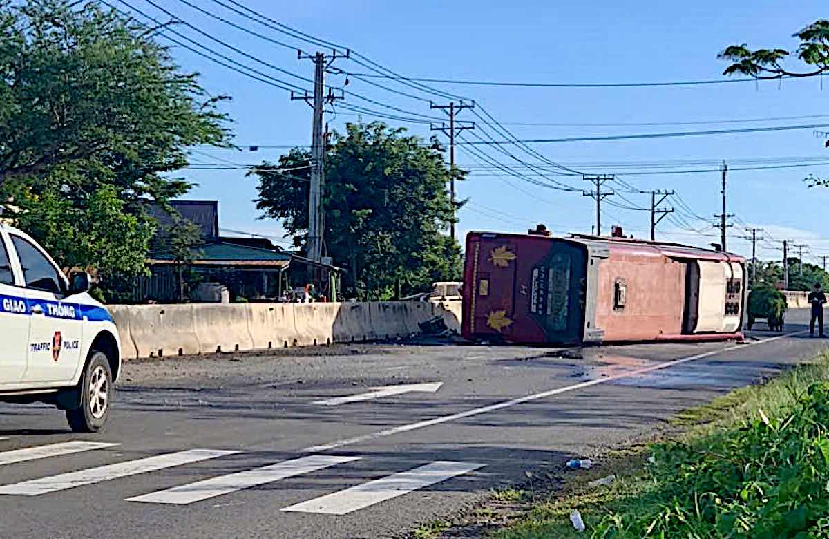 Binh Thuan - A sleeper bus was traveling when it had an accident and overturned in the middle of the road on National Highway 1.