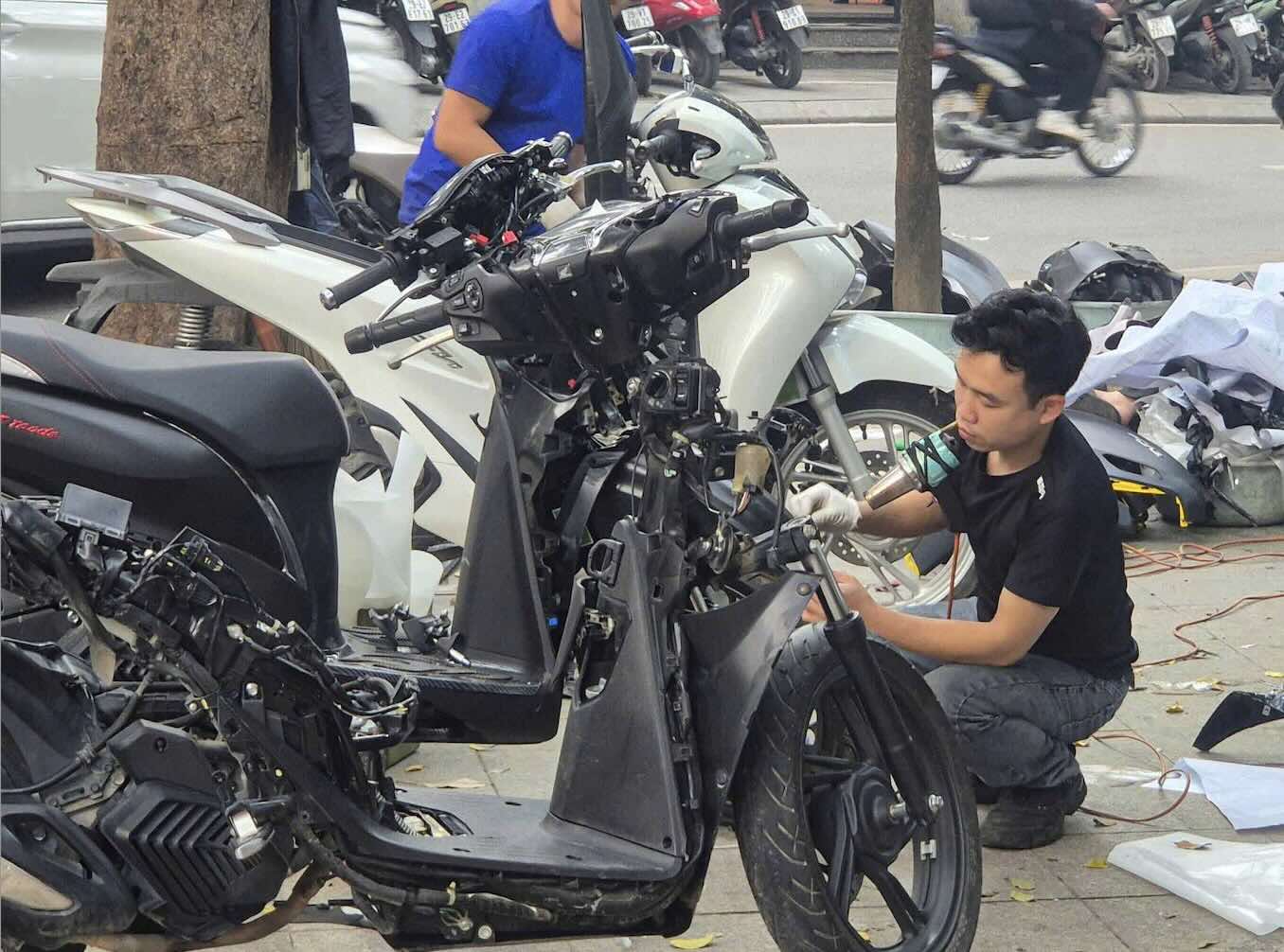 Near Tet, the demand for motorbike refurbishment is increasing sharply as many people want to "change clothes" for their vehicles before spring trips. On streets with many paint and nail art shops, changing car colors in Hanoi, the atmosphere these days is always overloaded. Cars are parked all over the sidewalks, workers are working continuously, and phone appointments ring non-stop.