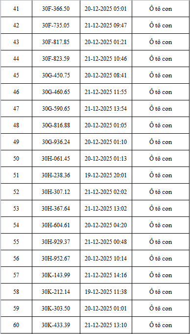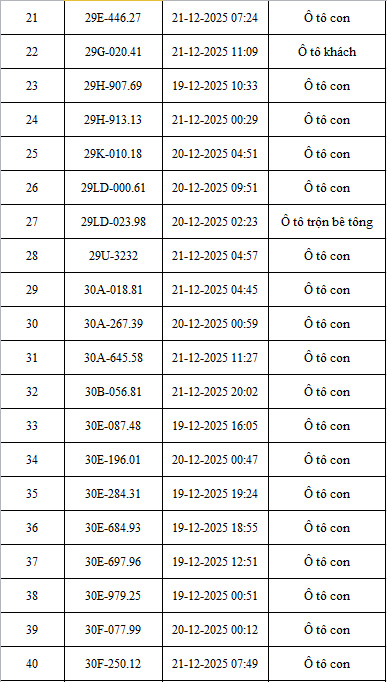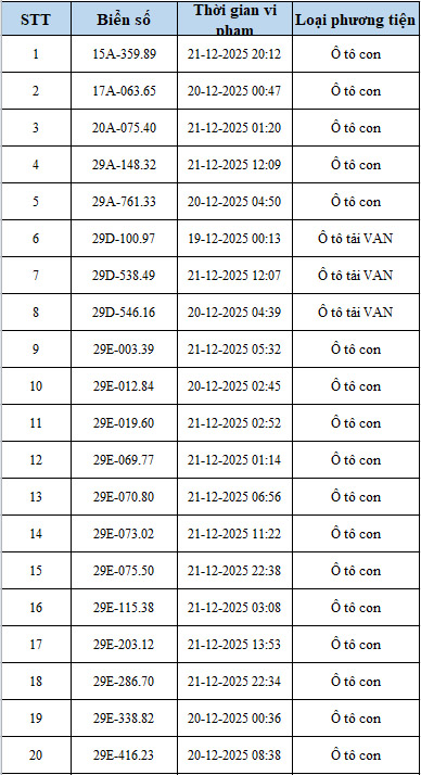 The Traffic Police Department (CSGT) - Hanoi City Police announced the list of vehicles violating administrative regulations on road traffic order and safety from December 19 - December 21, 2025 (cars). Violation images recorded through AI cameras operated by the Hanoi Traffic Police Department.
