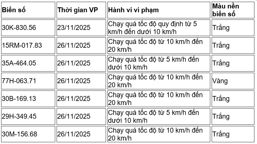 Hung Yen Police have just announced a list of vehicles that will be fined from December 1, 2025 to December 7, 2025. Among these, vehicle owners who were fined for speeding are as follows: