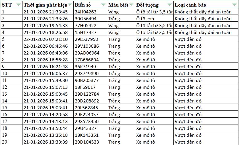 Information from the Traffic Police Department (CSGT) - Ministry of Public Security said that in the period from 12:00 on January 21 to 12:00 on January 22, the artificial intelligence (AI) application camera system operated by this unit recorded many cases of traffic order and safety violations in Hanoi and the Noi Bai - Lao Cai expressway.