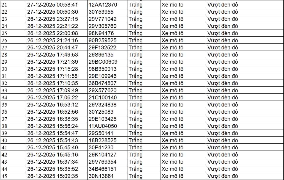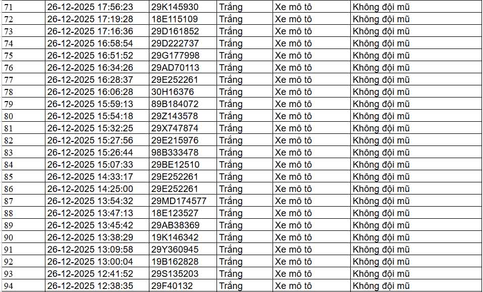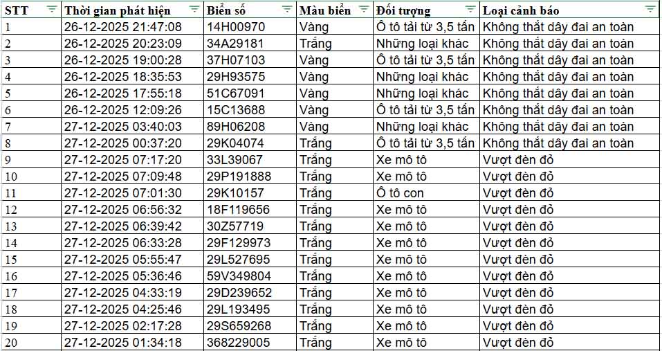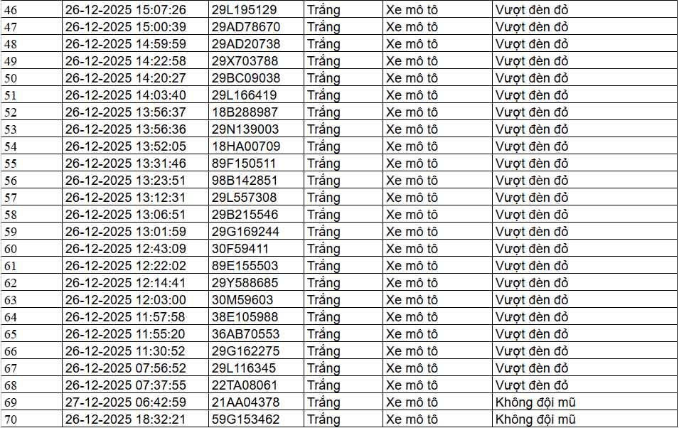 Information from the Traffic Police Department (CSGT) - Ministry of Public Security, in the period from 12:00 PM on December 26, 2025 to 12:00 PM on December 27, 2025, the artificial intelligence (AI) application camera system operated by this unit recorded a series of violations of traffic order and safety in Hanoi and the Noi Bai - Lao Cai expressway.