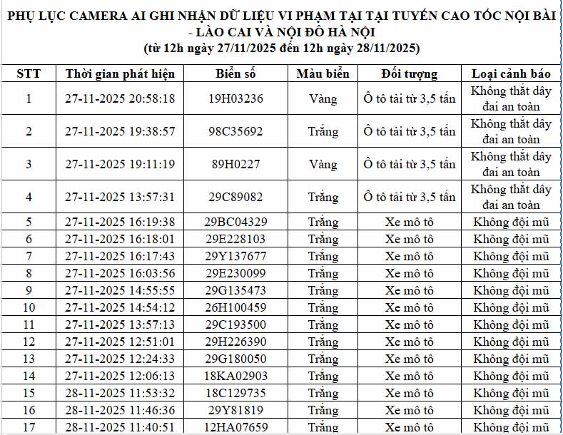 According to information from the Traffic Police Department (CSGT) - Ministry of Public Security, through data from the monitoring system, from 12:00 on November 27, 2025 to 12:00 on November 28, 2025, AI cameras located at km 20 of the Noi Bai - Lao Cai Expressway recorded 14,411 vehicles passing through, with an average speed of 69.5km/h.