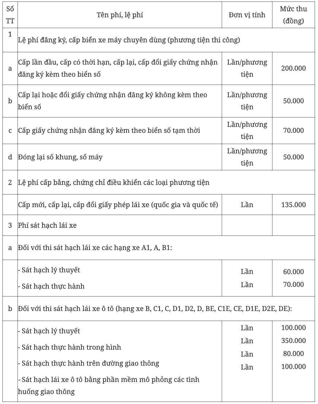The fee for collecting driving test fees; fees for granting certificates and certificates for operation on all types of vehicles and fees for registration and issuance of license plates for specialized motorbikes are specified in the Toll and Fee Charging Table issued with this Circular.