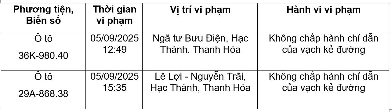 Previously, Thanh Hoa Police also publicly announced the list of vehicles that were fined from September 1, 2025 to September 10, 2025. Among these, there are car owners who violate the line tying violation as follows: