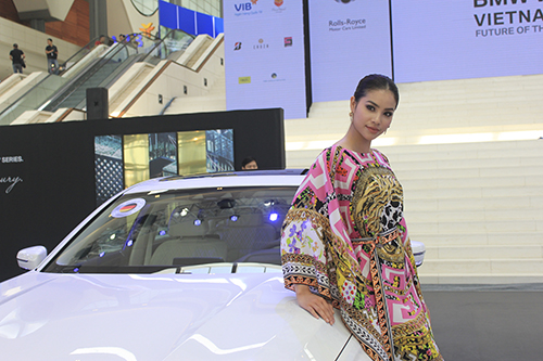 | Từ trước giờ diễn ra lễ khai mạc, Phạm Hương đã có mặt tại khu trưng bày những chiếc xe hạng sang này. |