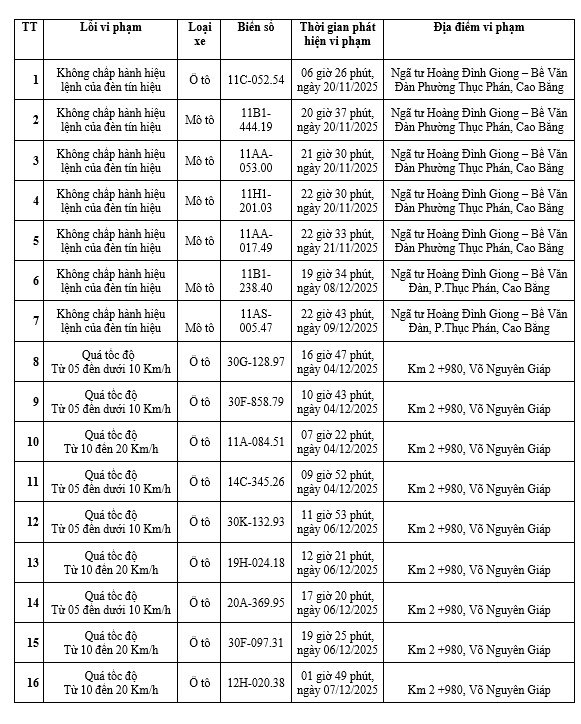 According to the announcement from Cao Bang Provincial Police, cases of driving cars and motorbikes violating violations such as speeding, being detected at Km2+980, Vo Nguyen Giap Street and running red lights at Hoang Dinh Giong - Be Van Dan intersection...