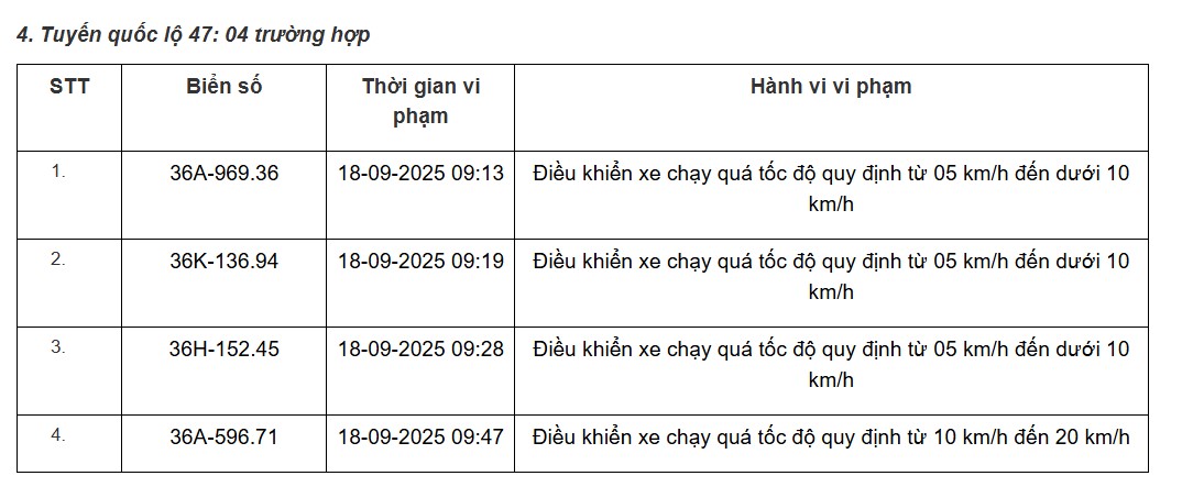 Previously, Thanh Hoa Police had just announced a list of fines for vehicles violating speed regulations on National Highway 1, National Highway 45, National Highway 47, National Highway 47B, Ho Chi Minh Road and National Highway 15 from September 16 to September 20.