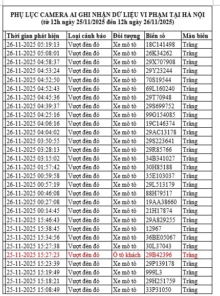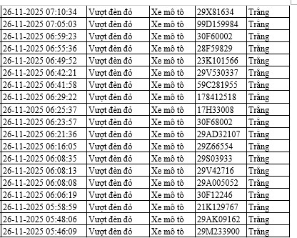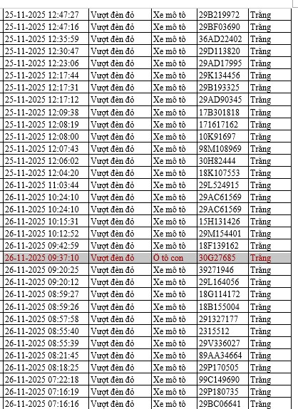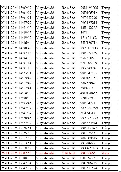 The Traffic Police Department said that from 12:00 on November 25, 2025 to 12:00 on November 26, through extracting data from AI cameras piloted in Hanoi's inner city (intersection of Pham Van Bach - Hoang Quan Chi streets), many cases of non-compliance with traffic light signals - running red lights have been automatically detected, including buses, passenger cars, and cars. The detailed list is as follows:
