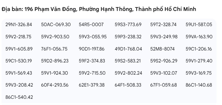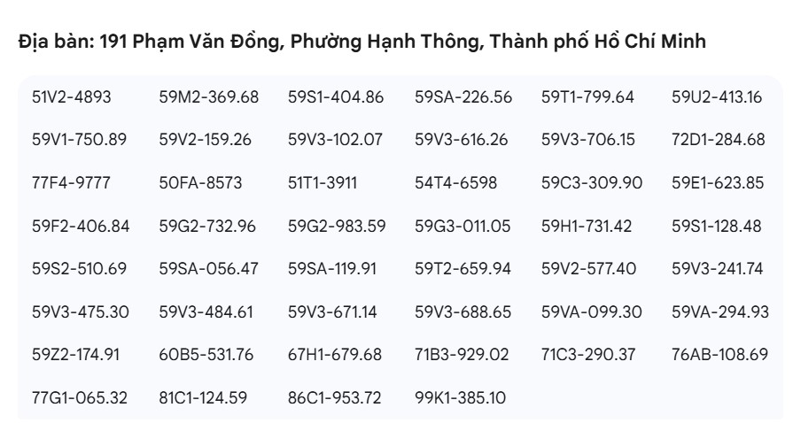 From September 22, 2025 to September 26, 2025, the Hang Xanh Traffic Police Team recorded and sent a notice of violation to the owner of the violating vehicle "Entering a road with a sign prohibiting entry for the type of vehicle being driven" in the Pham Van Dong level crossing area, Hanh Thong ward. The detailed list is as follows: