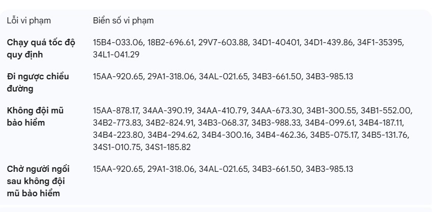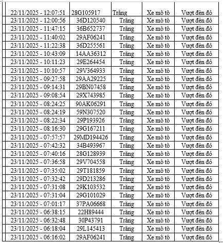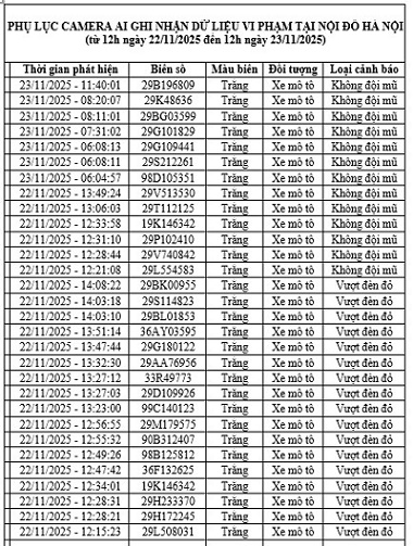 The Traffic Police Department reported that from 12:00 on November 18, 2025 to 12:00 on November 19, 2025, through extracting data from AI cameras piloted for installation in Hanoi's inner city (intersection of Pham Van Bach - Hoang Quan Chi streets), it has automatically detected owners of motorbikes violating the following errors: