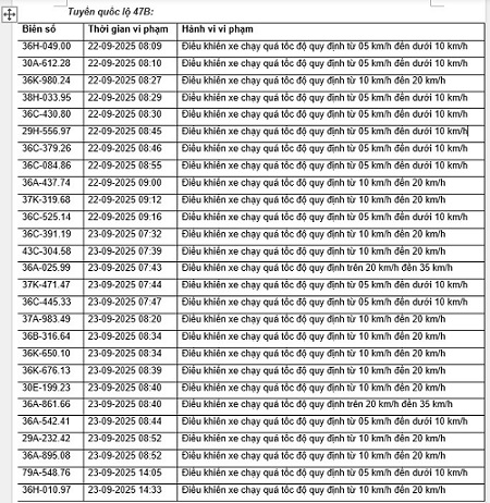 In early November, Thanh Hoa Police announced a list of vehicles that violated regulations on speed and were fined on the national highway from September 21, 2025 to September 30, 2025. Of these, National Highway 47 B alone has 47 cases as follows: