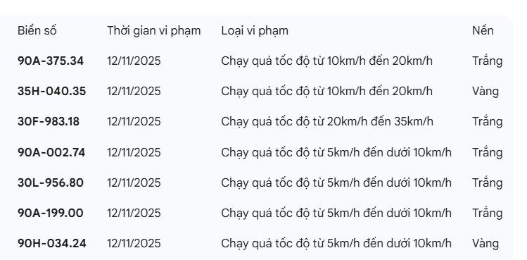 Ninh Binh Police announced the list of fines detected last week (from November 12 to November 16). Among these, cases of speeding are as follows: