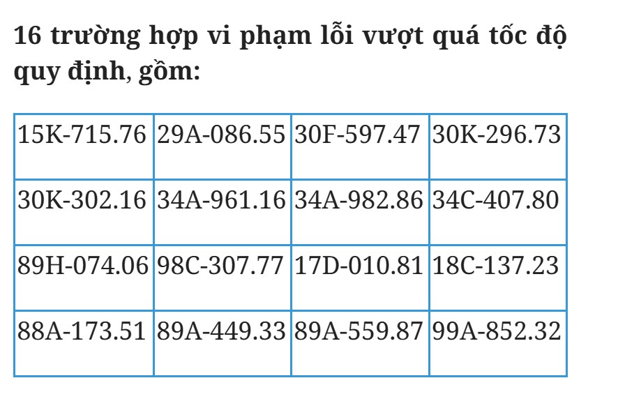 According to the report of the Traffic Police Department (Hung Yen Provincial Police), from October 6 to October 12, through exploiting the surveillance camera system and using professional equipment, the traffic police force recorded many cases of vehicles violating the Law on Road Traffic Order and Safety being fined. Of which, the most cases of speeding are as follows: