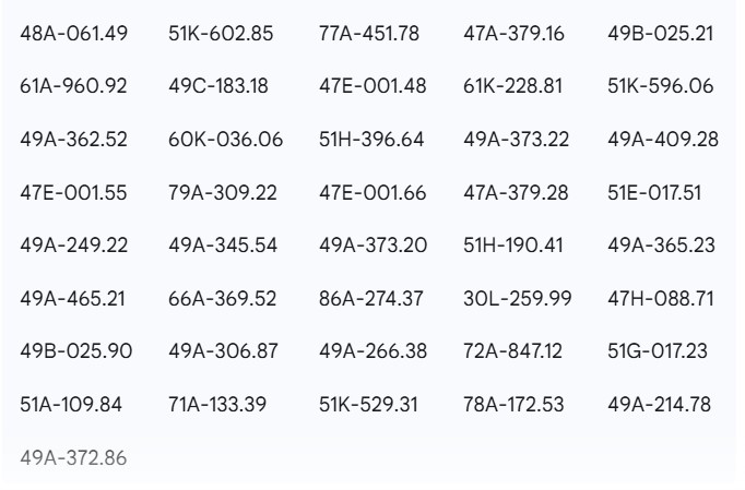 14H-59602, 26AE-04528, 29U6-4634, 34AA-450.11, 34B1-586.24, 34B2-448.85, 34B3-439.68, 34B3-477.46, 34B4-240.94, 34B4-629.01, 34B4-931.36, 34D1-107.03, 34F2-7251, 34M7-9837, 34P8-4677, 34S1-264.52.