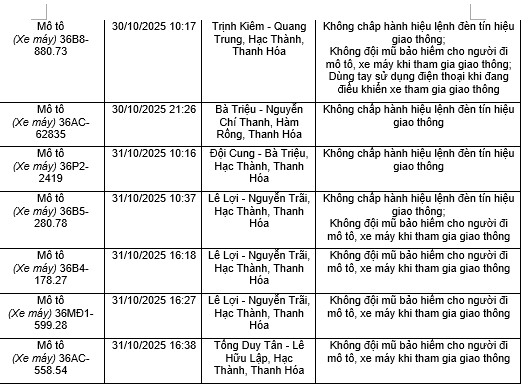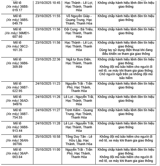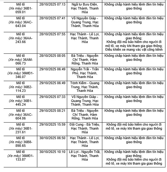Thanh Hoa Police announced the results of detecting vehicles violating traffic safety order through the security, order and traffic safety surveillance camera system from October 21, 2025 to October 31, 2025. Notably, among these are the motorcycle license plates that were fined as follows: