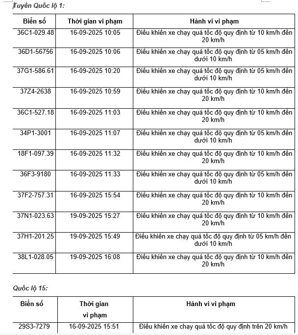 Thanh Hoa Police have also just announced a list of vehicles violating speed regulations on some national highways from September 16, 2025 to September 20, 2025. Notably, there are some cases of motorbike drivers violating as follows: