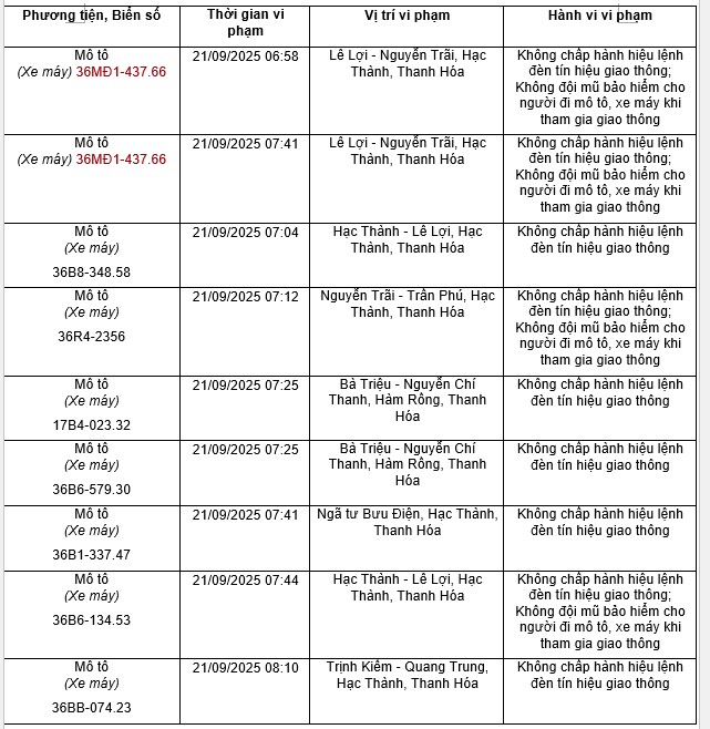 Previously, Thanh Hoa Police informed about cases of fines from September 21, 2025 to September 25, 2025. Among these, motorbike drivers are fined as follows: