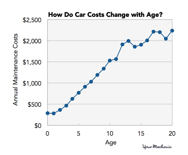 Cũng giống như cơ thể con người, xe càng "già" đi, thì chi phí tiêu tốn cho bảo dưỡng càng cao lên. Trong 10 năm đầu, chi phí bảo dưỡng xe sẽ tăng đều đặn 150 USD/năm. Sau đó, trong giai đoạn từ 11 đến 12 năm tuổi chi phí sẽ tăng nhảy vọt, sau 13 năm trở đi thì chi phí cho xe một năm sẽ ở tầm 2000 USD.