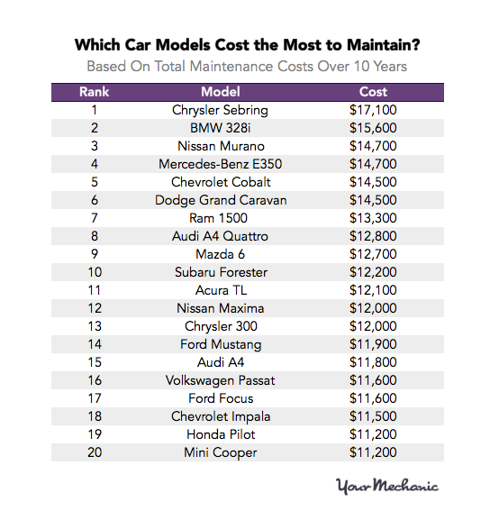 Tuy nhiên, chi phí sử dụng và bảo dưỡng xe của các hãng xe khác nhau cũng không hề giống nhau. Trang Yourmechanic đã sử dụng nguồn dữ liệu khổng lồ từ những xe họ đã làm dịch vụ bảo dưỡng và sau đó đưa ra bản đánh giá những thương hiệu ô tô nào có chi phí bảo dưỡng xe đắt đỏ nhất trong vòng 10 năm tuổi đời của xe.