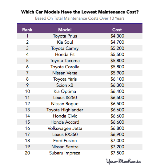 Toyota dẫn đầu danh sách với mẫu Prius vốn nổi tiếng về độ tin cậy, chi phí bảo dưỡng trong 10 năm chỉ tốn 4300 USD, tức là khoảng 430 USD/năm. Bám sát Prius là mẫu xe Nhật Honda Fit và xe Hàn quốc Kia Soul.