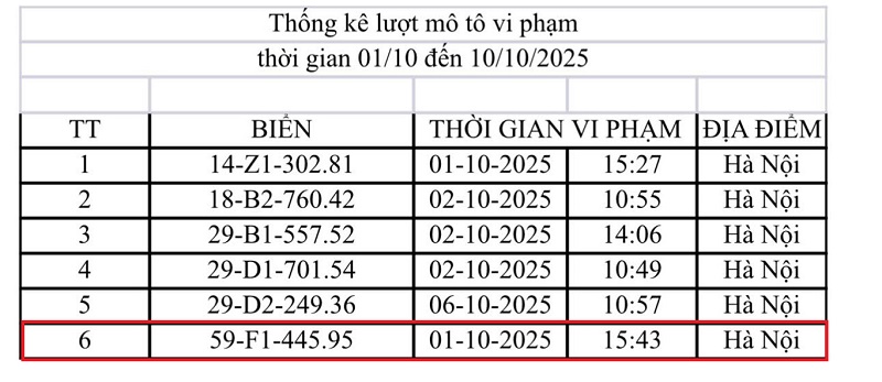 Previously, the Traffic Police Department, Hanoi City Police said that from October 1 to October 10, 2025, the police will fine many violations. Notably, among these, there are motorbikes with Ho Chi Minh City license plates that violate ( marked) as follows: