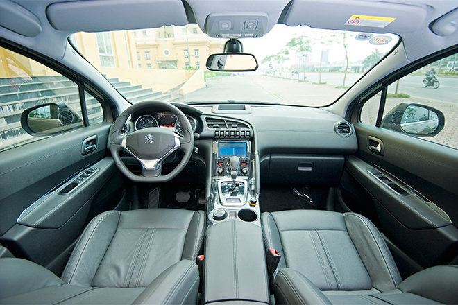Tay lái 3008 bọc da được mạ Crom tại vị trí các chấu tích hợp các nút điều chỉnh chức năng âm lượng, đàm thoại ở phía sau. Bảng đồng hồ hiển thị trung tâm sắc nét thiết kế dạng phi thuyền giúp người lái vừa điều khiển phương tiện vừa quan sát được những thông tin như vận tốc. Ngoài ra, màn hình HUD nổi bật hiển thị các thông số cơ bản mang lại phong cách thể thao và hệ thống điều chỉnh dạng nút gạt mang phong cách hiện đại.