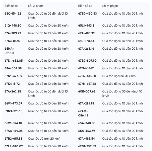 Hung Yen Police have just announced a list of vehicles that will be fined from December 8, 2025 to December 14, 2025. Among these, vehicle owners who were fined for speeding are as follows: