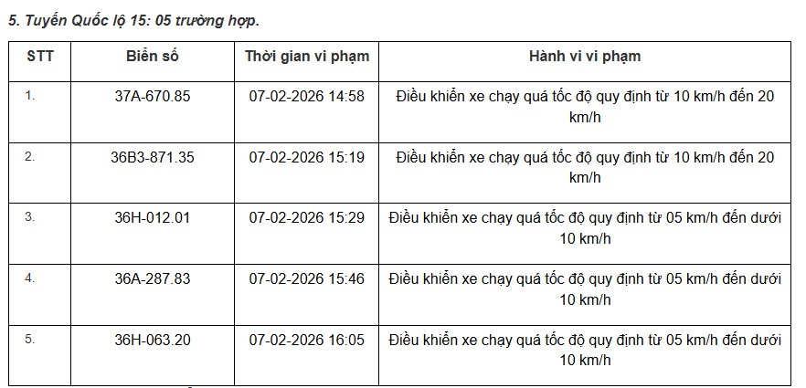 Thanh Hoa traffic police announce the list of vehicles violating speed regulations on some national highways from February 1, 2026 to February 15, 2026. In which National Highway 15 alone has 5 cases as follows:
