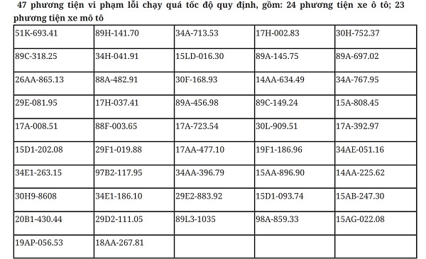 Among them, there are 47 cases of violations of speeding. The detailed list is as follows: