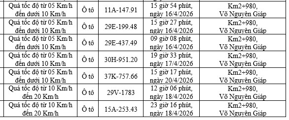Hung Yen Police said that from April 20 - April 26, through the camera system, functional forces discovered many cases of speeding. List as follows: