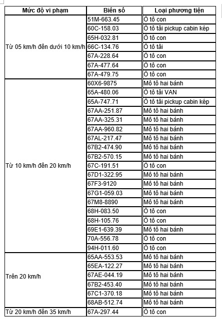 An Giang Police announces that vehicles violating traffic laws will be fined by traffic cameras from January 15 to January 31, 2026. Among these vehicles fined by traffic cameras for speeding are as follows: