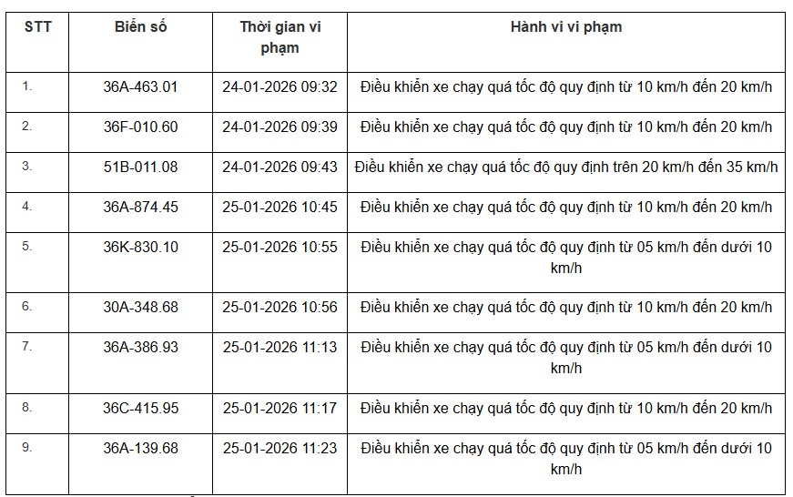 Thanh Hoa Police also announced the list of vehicles violating speed regulations on some national highways 1. National Highway 45 alone has 9 violations as follows: