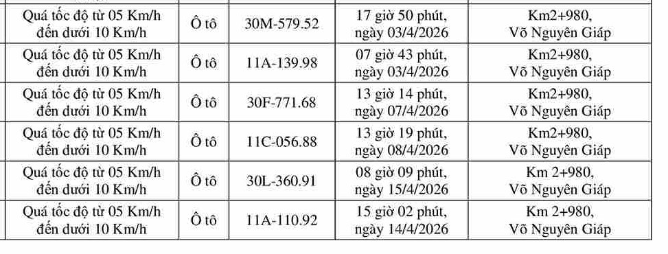 Cao Bang Police have just announced the list of traffic tickets for speeding from April 2nd to April 15th. The list is as follows:
