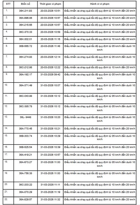 Thanh Hoa Police also said that from March 16 - March 31, through the camera system, functional forces discovered many cases of speeding. National Highway 45 alone has 22 cases as follows: