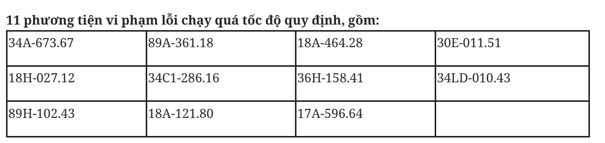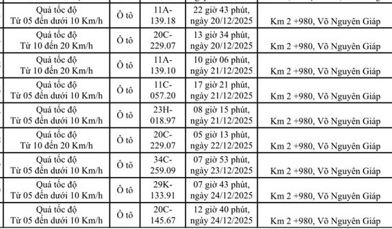 Cao Bang Police also announced the list of vehicles fined for speeding from December 18, 2025 to December 25, 2025. Among these, car owners are fined for speeding as follows: