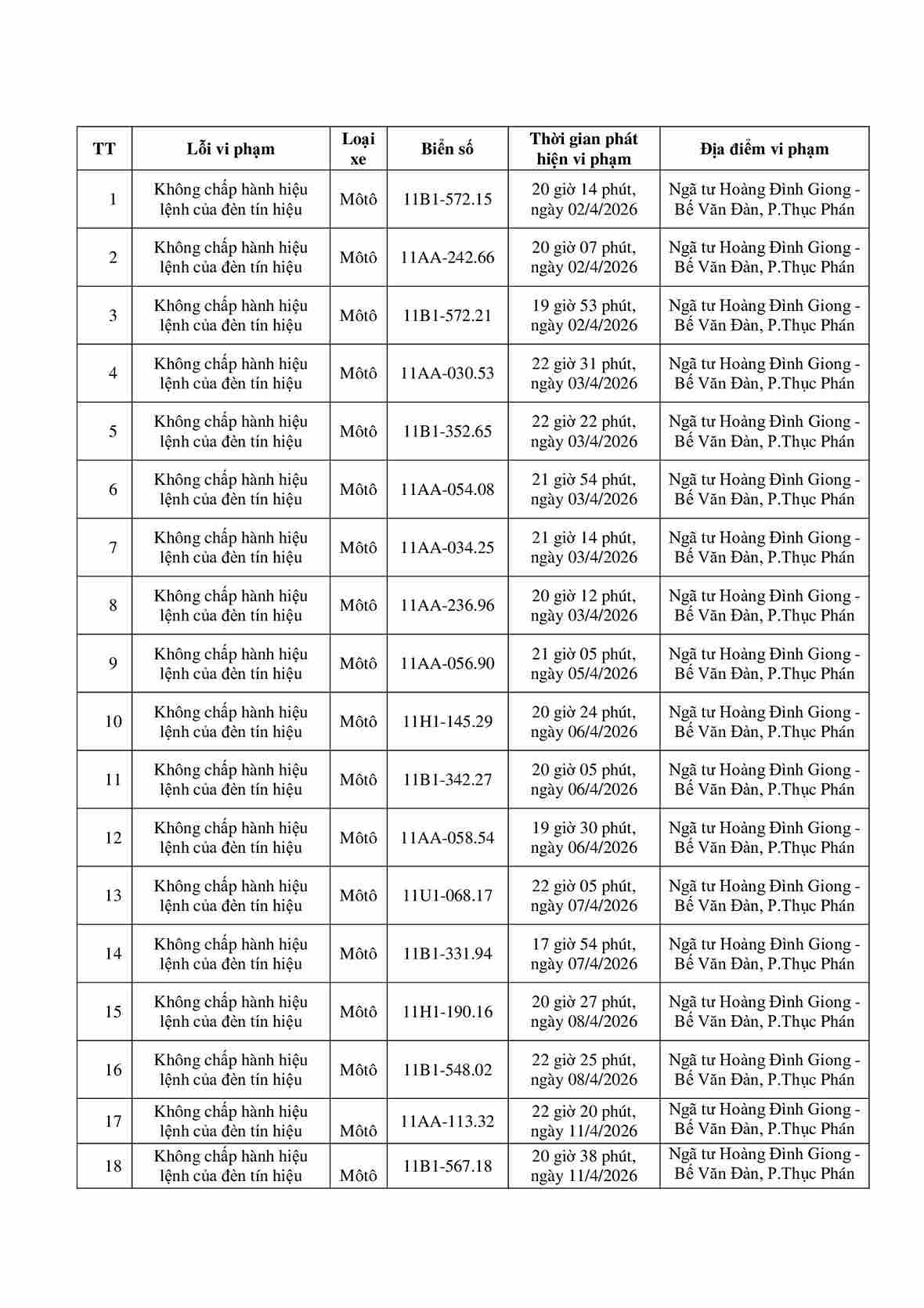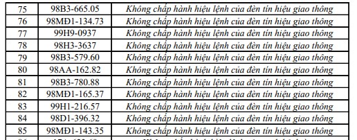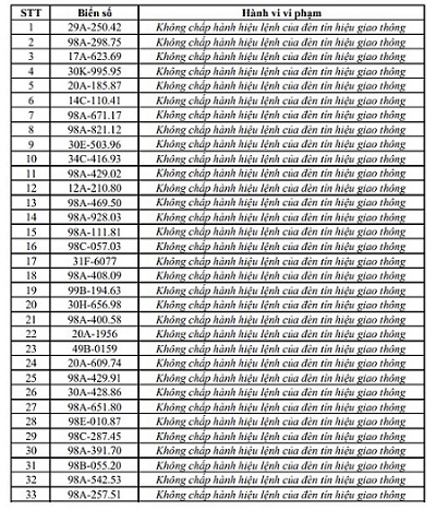 Bac Ninh traffic police said that from April 11 to April 17, through exploiting the surveillance camera system and using professional equipment, traffic police forces recorded many cases of running red lights. The list is as follows: