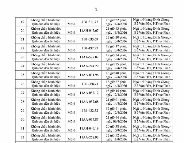 In Hanoi, the Traffic Police Department (CSGT) - Ministry of Public Security, from 7:30 am on April 14 to 7:30 am on April 15, 2026), through data analysis, the system discovered common violations such as running red lights, not wearing helmets. Among them, the following motorbike owners were fined remotely:
