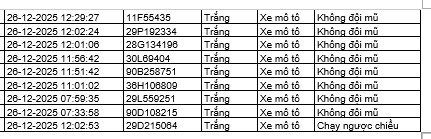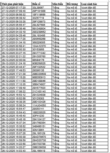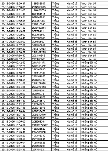 The Traffic Police Department announces that from 12:00 PM on December 26, 2025 to 12:00 PM on December 27, 2025, data extracted from AI cameras detected many motorbikes violating the following errors:
