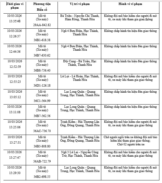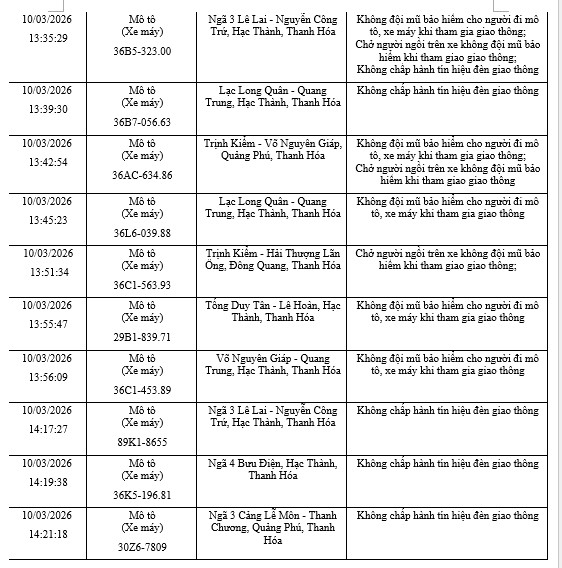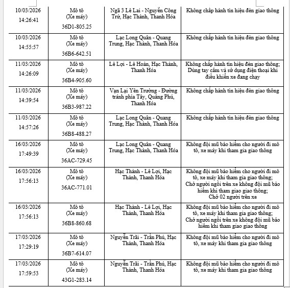 The Traffic Police Department, Thanh Hoa Provincial Police said that from March 5 to March 21, through exploiting the surveillance camera system and using professional equipment, the traffic police force recorded many cases of motorbike violations. The typical list is as follows: