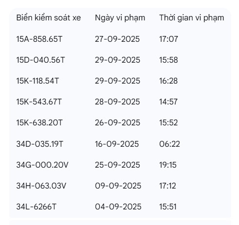 Hanoi Police said that the list of violating vehicles in September (from September 1 to September 30), including Hai Phong license plate vehicles, is as follows: