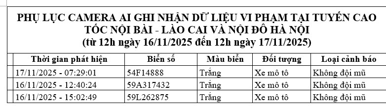 The Traffic Police Department said that from 12:00 on November 16, 2025 to 12:00 on November 17, Camera A.I discovered many vehicles being fined in Hanoi's inner city. These include HCMC-licensed vehicles as follows: