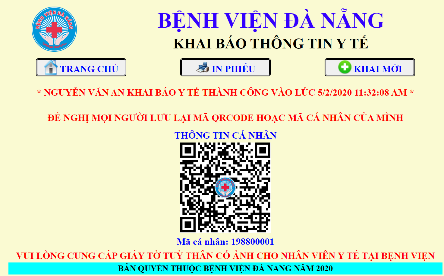 Khi đã khai báo thành công, người dân sẽ có thông tin về QRCode hoặc mã cá nhân. Khi đến Bệnh viện Đà Nẵng, người dân chỉ cần cung cấp 1 trong 4 thông tin như số điện thoại, số CMND, QRCode, mã cá nhân cho nhân viên y tế để nhận biết bạn đã khai báo y tế trực tuyến.