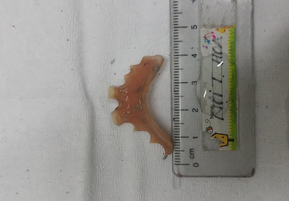 Trong lúc uống thuốc, người phụ nữ ở Quảng Ngãi không may nuốt răng giả và vừa được các bác sĩ nội soi gắp ra ngoài.